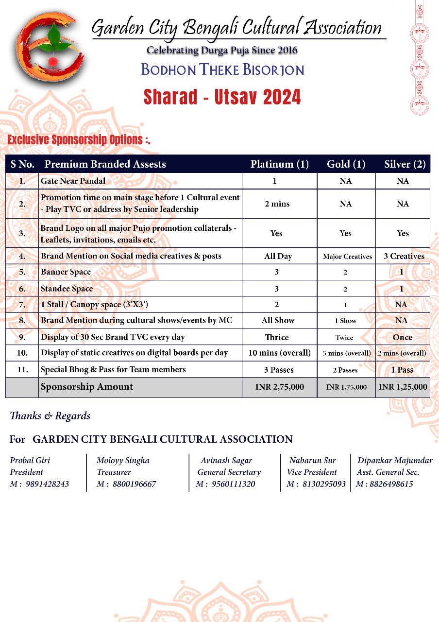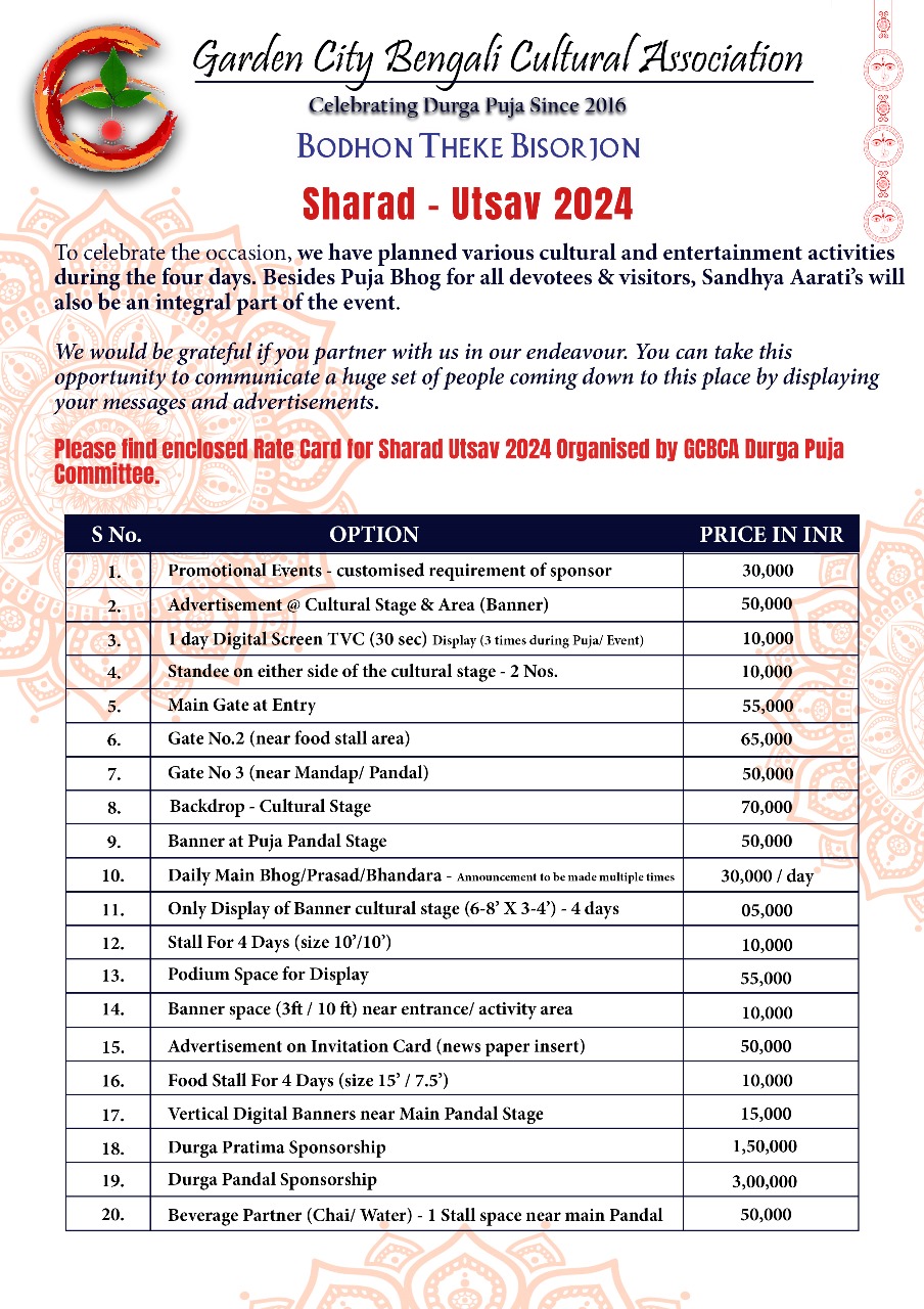 Revised Rates for Durga Puja Sponsorship 2024-2025 will be updated soon.